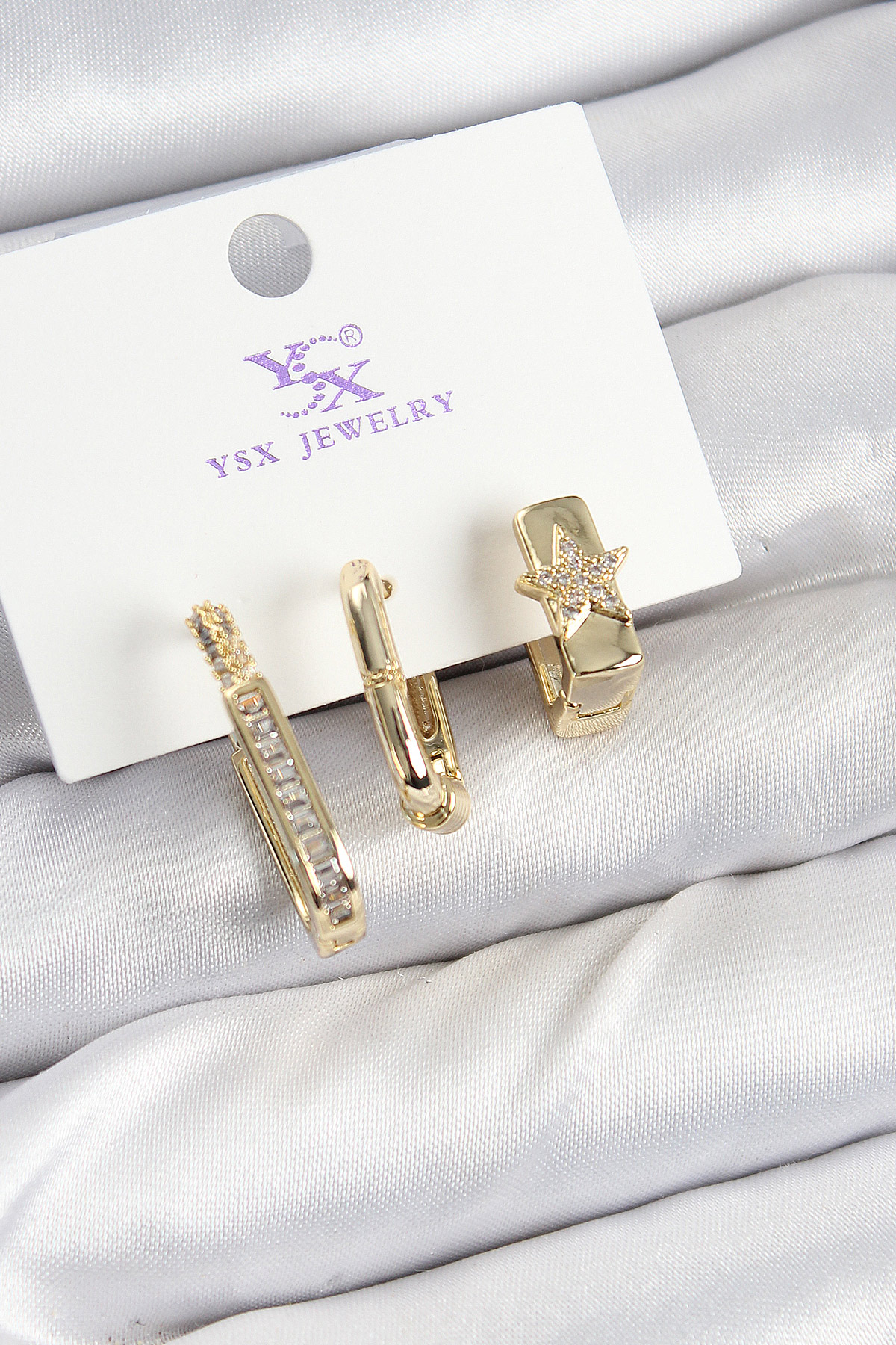Pirinç Zİrkon Taşlı Yıldız Model Gold Renk 3’lü Kadın Küpe