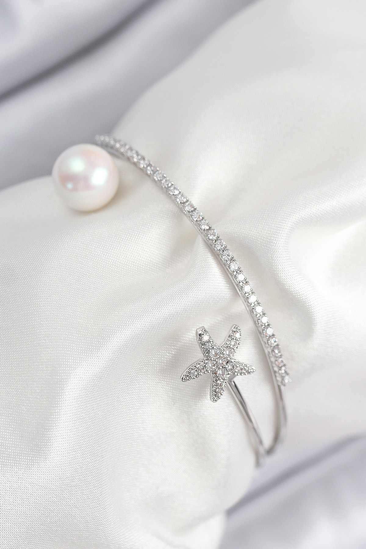 Pirinç Zirkon Taşlı Yıldız Ve İnci Model Gümüş Renk Kadın Bileklik