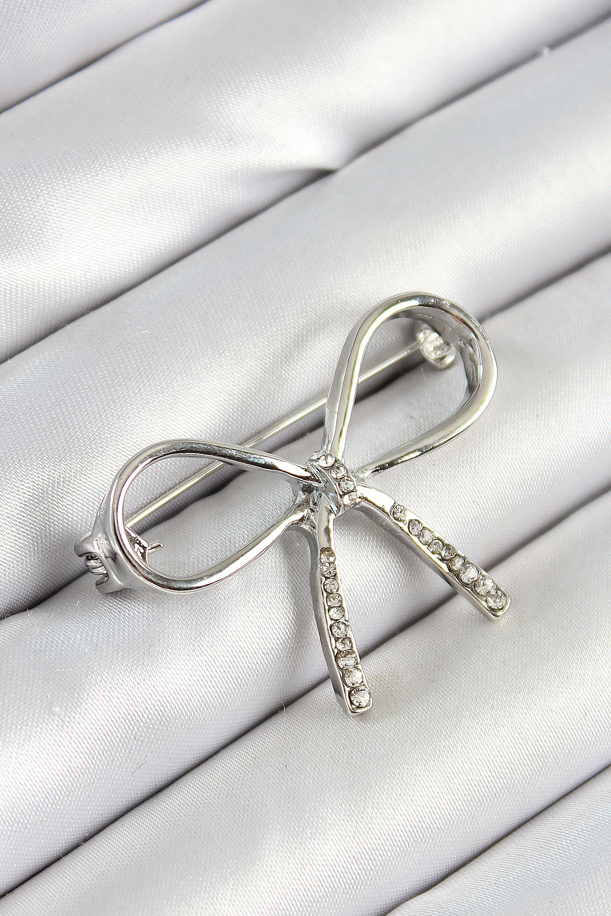 Zirkon Taş Detaylı Fiyonk Figürlü Gümüş Renk Kadın Broş